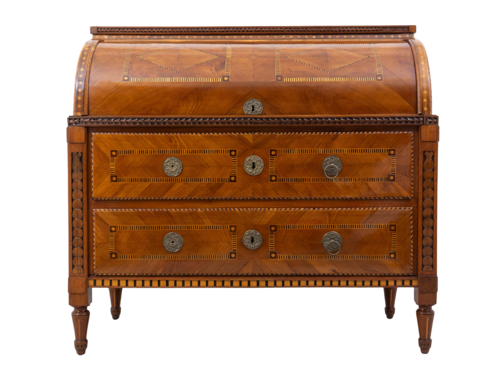 A hengertetejű felépítmény finom intarziadíszítéssel és gondosan keretezett szegélyekkel készült, és könnyed mozgással nyílik, feltárva a praktikus írólapot, valamint a dokumentumok és személyes tárgyak tárolására szolgáló belső rekeszeket. A hengerrész alatt három fiók található, részletgazdag berakásokkal és eredeti bronz kulcscímerekkel, amelyek bőséges tárolókapacitást biztosítanak.